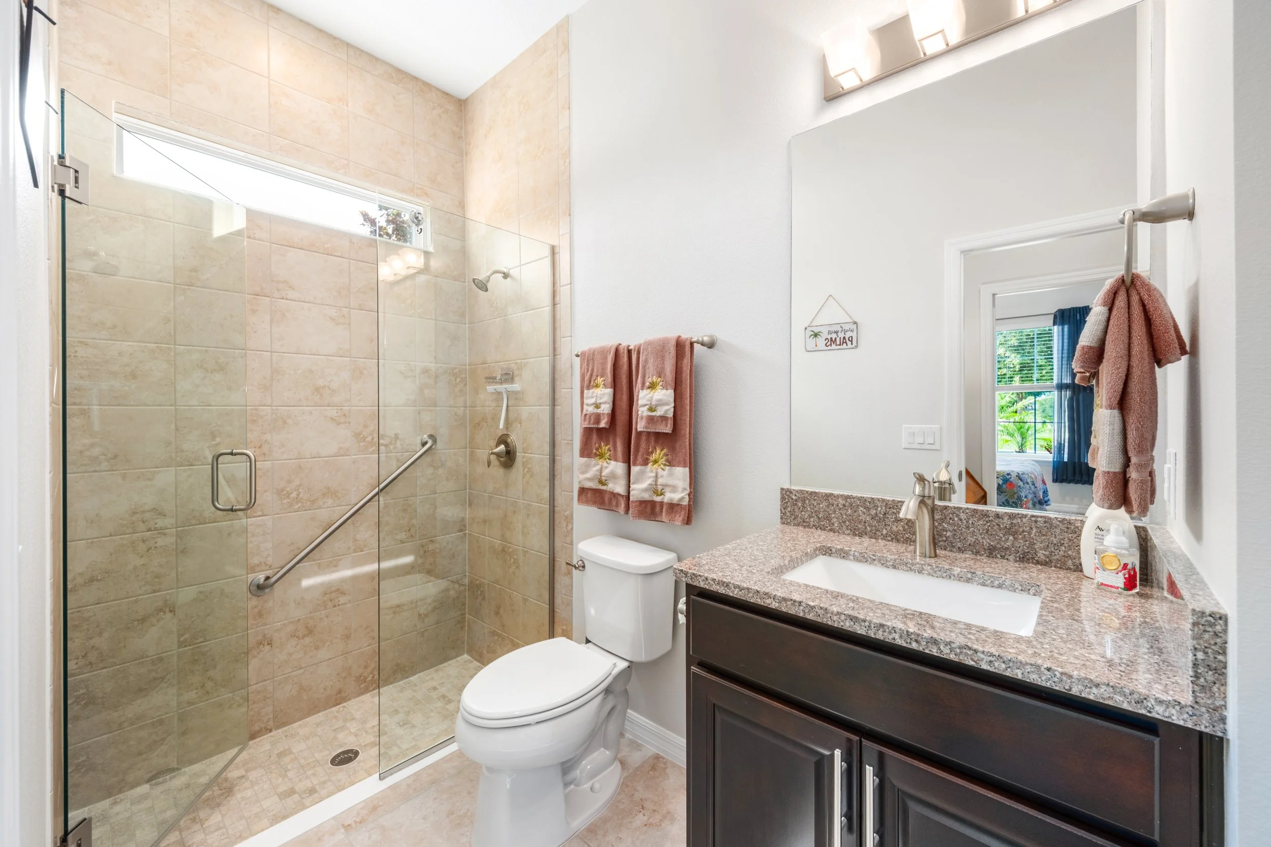 Inside the spacious primary bedroom, the tropical pool view helps you relax, and the en-suite bath offers a granite topped double sink vanity and large, frameless glass shower enclosure featuring a rainfall showerhead and tiled bench seat. Separate toilet room, linen closet, and gigantic walk-in closet round out the primary bath.